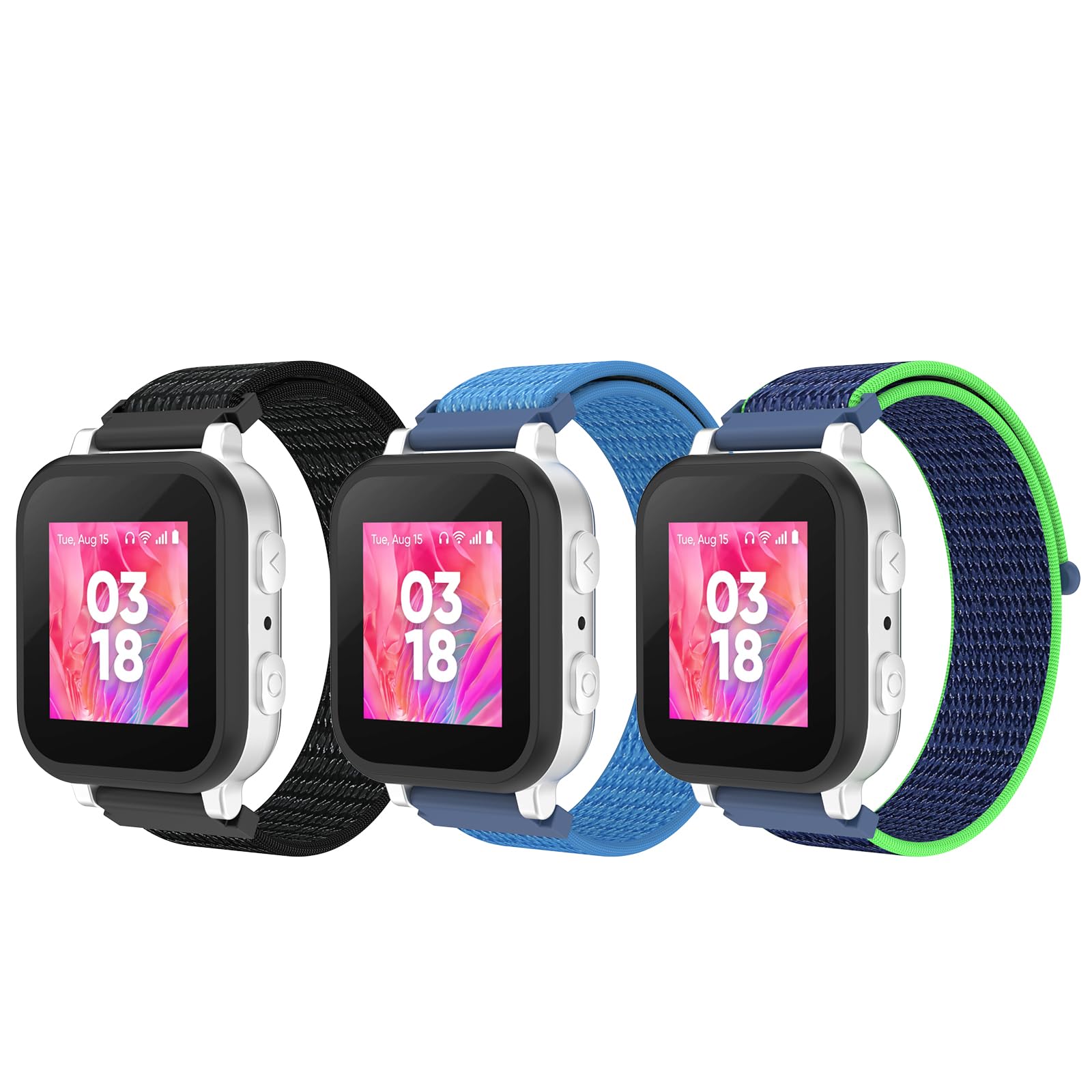 [Colorful Options]Crafted from nylon material, the three-color band set features vibrant colors that are stain-resistant and easy to clean. The 20mm universal buckle ensures seamless compatibility with multiple children's watches. Children can freely switch colors based on different scenarios such as school, sports, or outings, while the spare design reduces the need for frequent purchases.