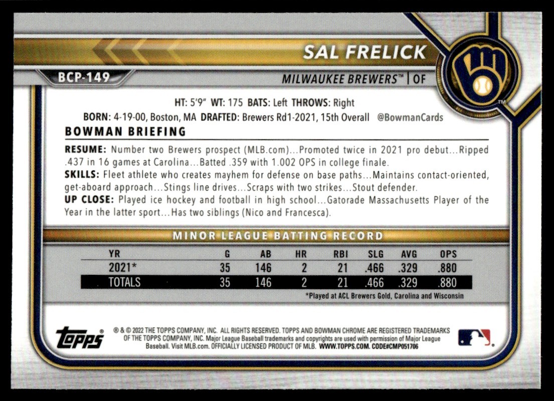 | Sal Frelick 2022 Bowman Chrome Prospects Rookie Card #BCP-149 Milwaukee Brewers |