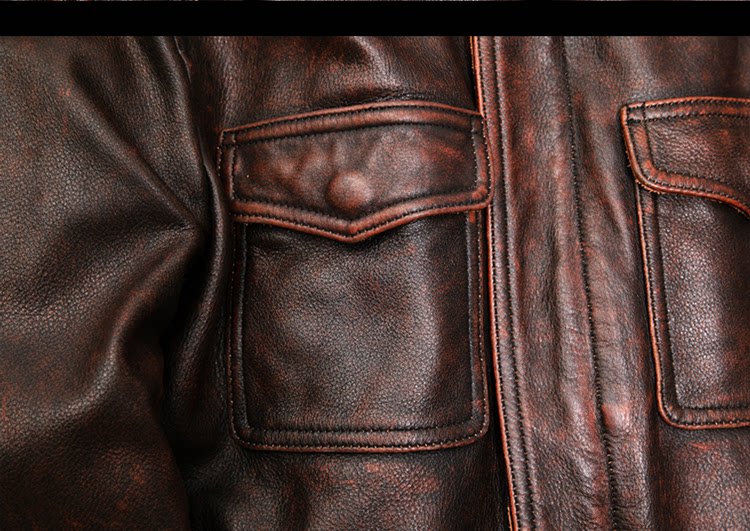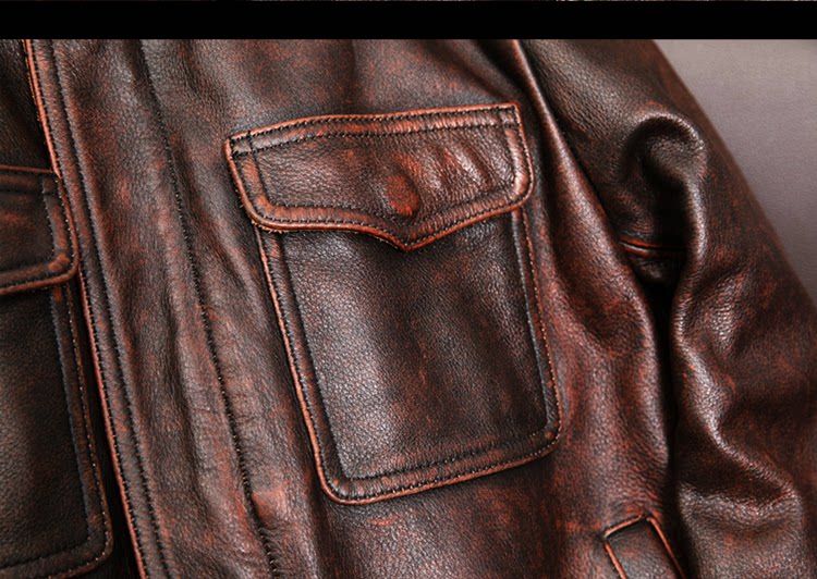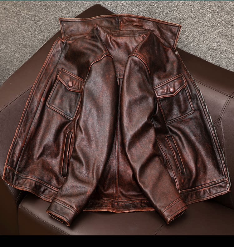 Mens Cowhide Leather Jacket Zipper Lapel Collar Workwear Motorcycle Retro Jacket