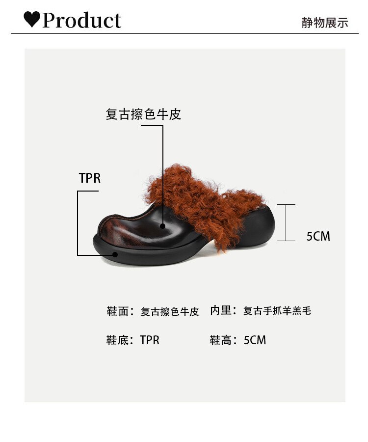 Winter Retro Women Wool Fur Curly Slippers High Heels Leather Warm Half Slippers