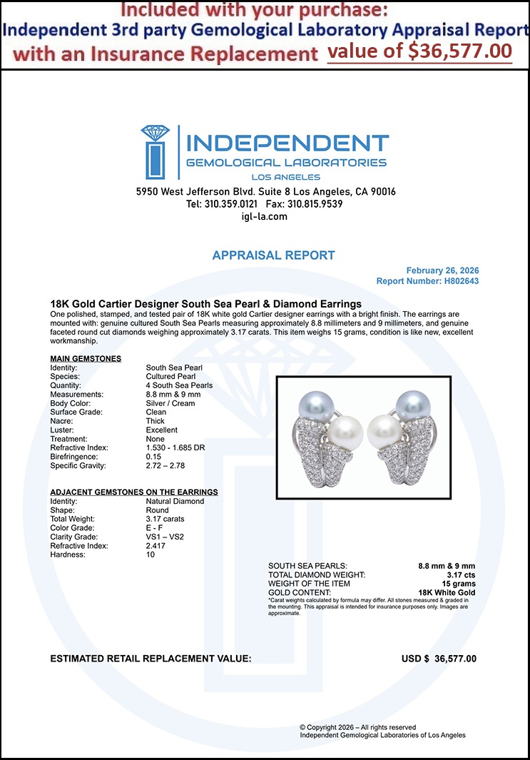 Your purchase is 100% risk-free because of our return policy and customer satisfaction guarantee. Included with the item is an appraisal report with an insurance replacement value of $36,577.00 from an independent 3rd party gemological laboratory IGL (Independent Gemological Laboratories) also documenting the authenticity, quality and characteristics of this item. also documenting the authenticity, quality and characteristics of this item. We hope you take advantage of this excellent item and rare opportunity to own MASSIVE genuine DESGINER Collectors South Sea Pearl and Diamond earrings below retail prices. This is a very elegant jewelry piece that anyone has a chance to win because this is a real NO RESERVE auction. Highest bidder takes it no matter what the price! |