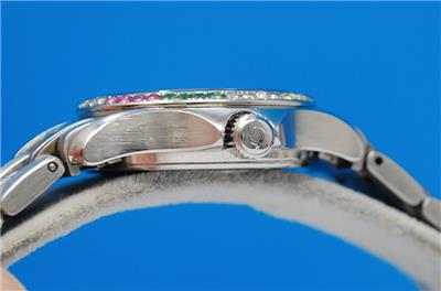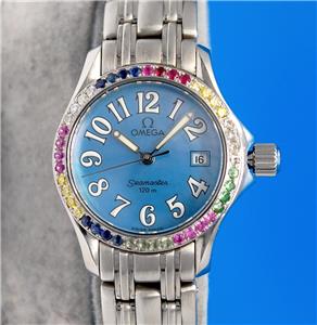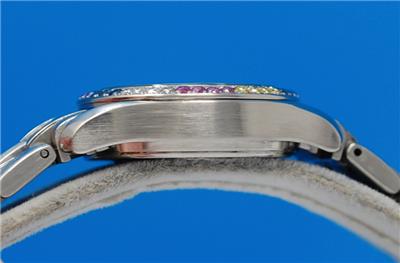 Condition: This is reference # 2581.88 which is already a beautiful and rare blue Arabic Mother of Pearl Dial. Additionally, it has been upgraded with a custom multi-stone bezel that complements the dial perfectly. Sapphire crystal looks fantastic. Dial/hands are amazing. Bezel shines like new. Bracelet shows virtually no wear, retains original brushed/polished finishes, etc. Crown screws down perfectly. All functions have been tested and work perfectly.