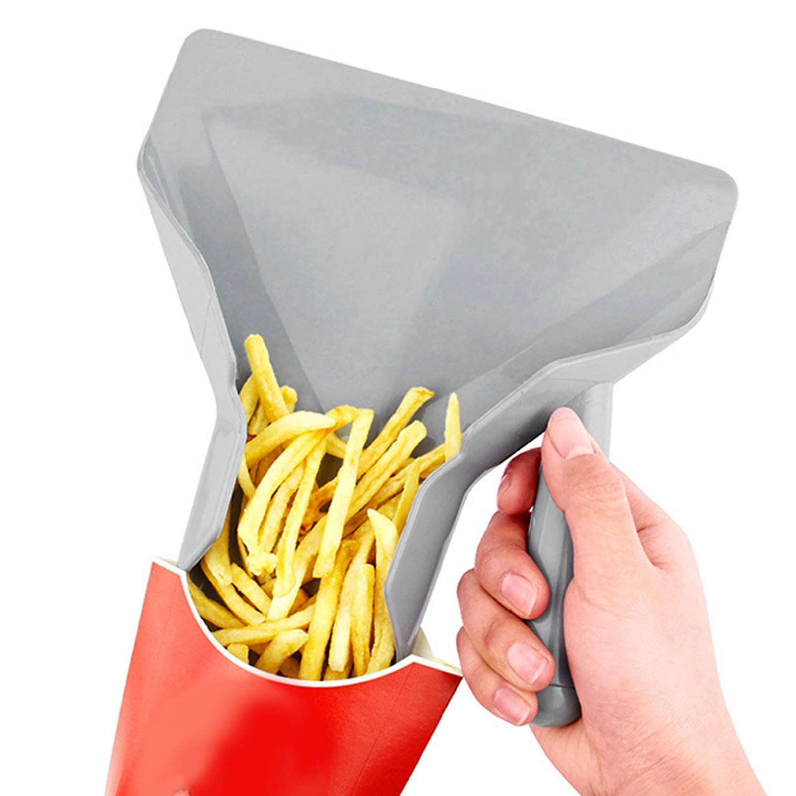 RIGHT HANDED DESIGN: French fry bag designed for right handed use, putting fries or popcorn into bags, boxes and bowls easily and quickly. Hands on the right, more convenient for you to use.