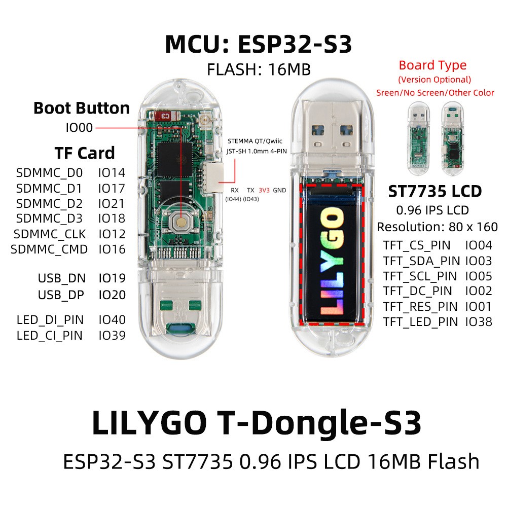 *Connectivité polyvalente : le T-Dongle-S3 est doté de capacités compatibles WiFi et , permettant une communication sans faille et une interaction avec divers appareils, parfait pour les applications et projets d'Pour IoT.
