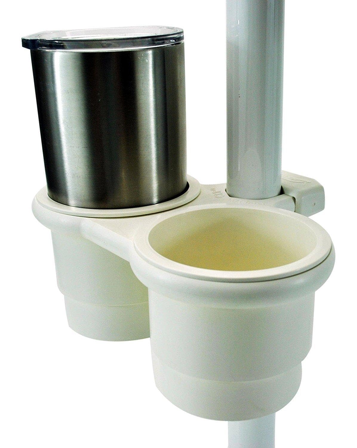 We offer 2 adustable sizes, small and large. This is the Large Version. See the sizing picture included and for your correct size. Durable High Quality Completely Weatherproof Patented Universal Clamp-on Mount Boat Cup Holders The large version universal clamp fits from 1 1/2 inch up to 2 inch outside diameter. Once installed, will rotate 360 when pushed around pipe but will not migrate down unless forced. Smart Cup - Fits, 20 & 30 oz. Larger Tumbler Cooler Cups & a can with or without a foam insulator. Stabilized to resist saltwater, UV damage, harsh outdoor elements & abuse. Comes w/slot for pliers. Will not get brittle, yellow, or break down.