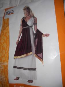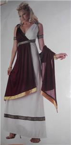 This womans size M 8-10 Sexy Roman Empress Costume by California Costume has a good quality polyester jersey dress with attached drape, stretchy black and gold armbands and gold plastic shoulder medallions. (Jewelry and hair ornaments show in picture are not part of the costume.) The costume was removed from the packaging to check it over before listing.It has not been worn. Add a pair of sexy spike heel sandals, decadent earrings and you're ready to rule the universe. (24)