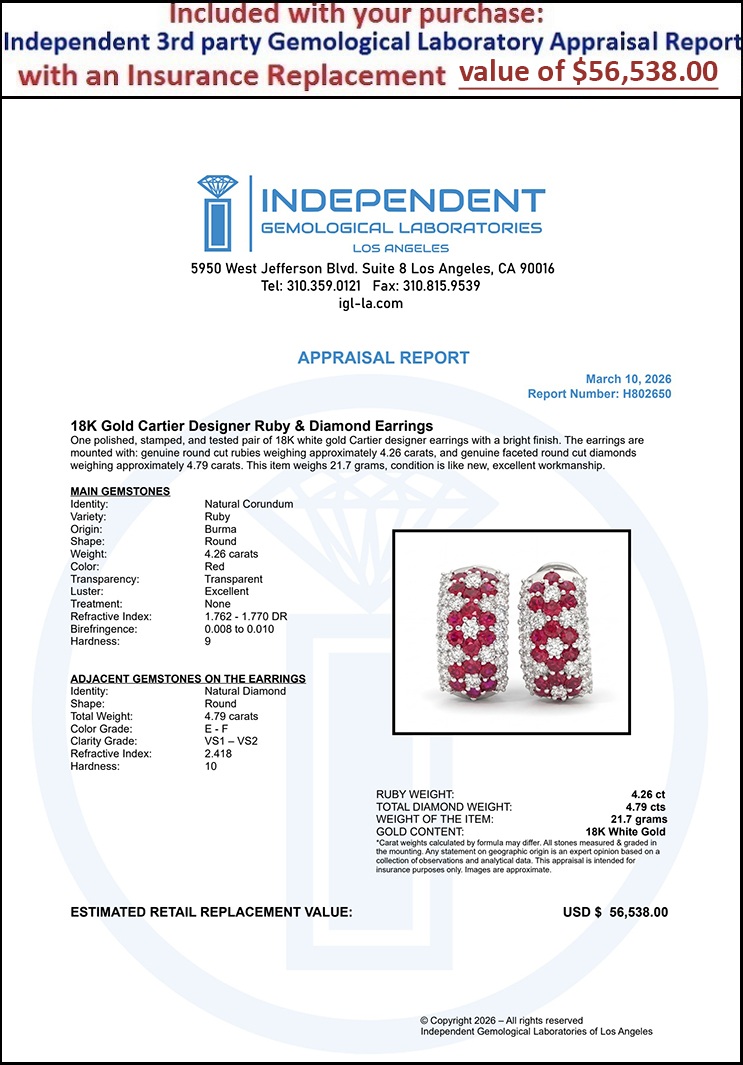 Your purchase is 100% risk-free because of our return policy and customer satisfaction guarantee. Included with the item is an appraisal report with an insurance replacement value of $56,538.00 from an independent 3rd party gemological laboratory IGL (Independent Gemological Laboratories) also documenting the authenticity, quality and characteristics of this item. also documenting the authenticity, quality and characteristics of this item. We hope you take advantage of this excellent item and rare opportunity to own MASSIVE genuine DESGINER Collectors Diamond & Ruby earrings below retail prices. This is a very elegant jewelry piece that anyone has a chance to win because this is a real NO RESERVE auction. Highest bidder takes it no matter what the price! |