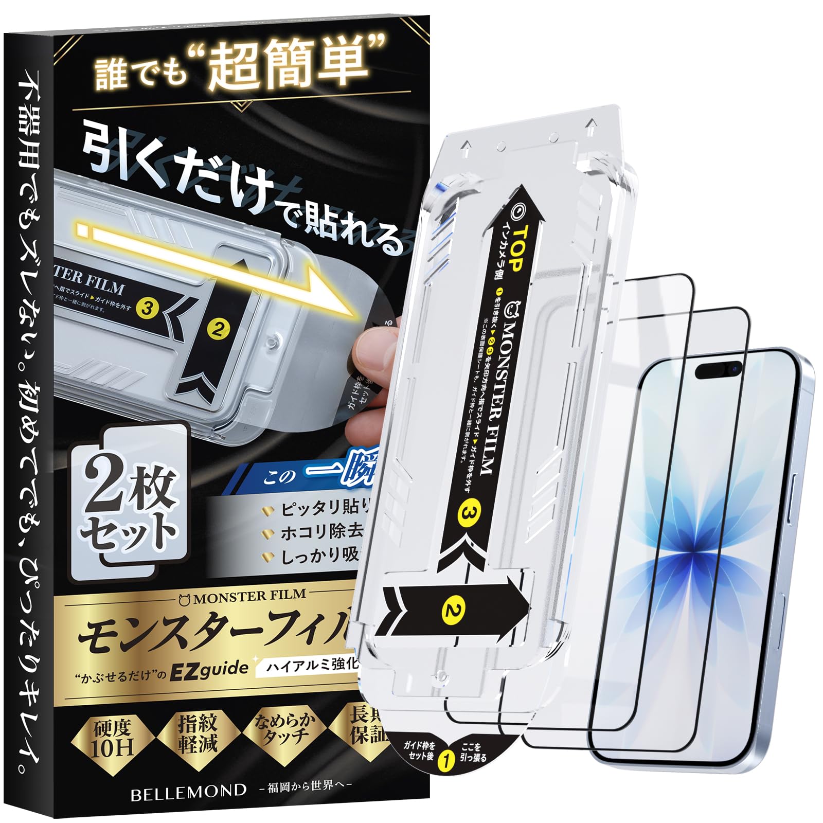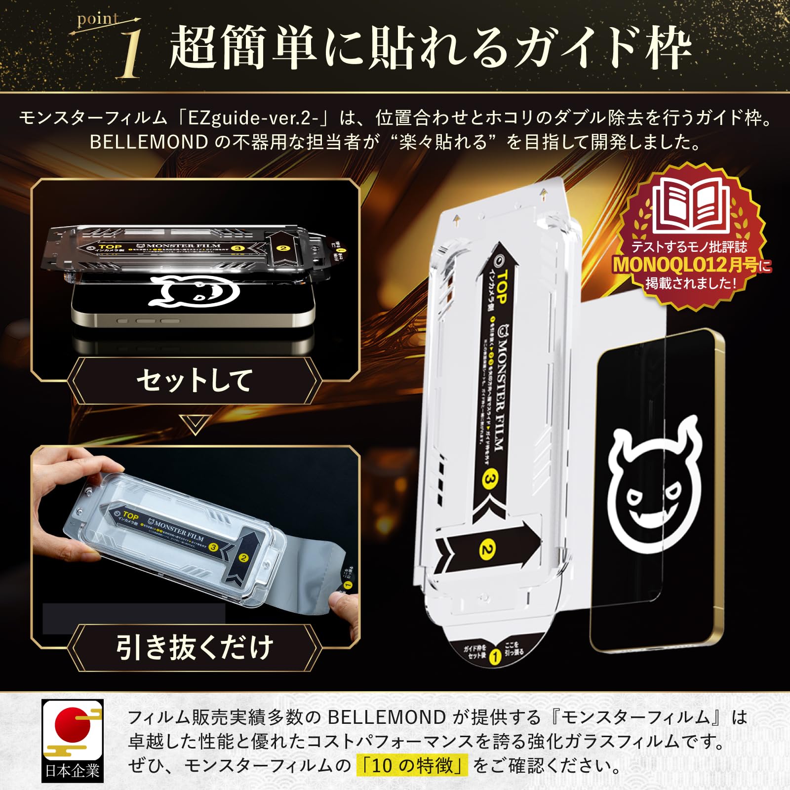[Reason for developing Monster Film] The most common complaint we received about film application was failure to apply. To completely eliminate failures, we conducted extensive research and prototyping to create Monster Film EZguide-Ver.2-. [EZguide-Ver.2-] The design has been revised from the first generation, and to further suppress misalignment and dust intrusion, it has a simple structure of just set and pull out that makes application super easy.
