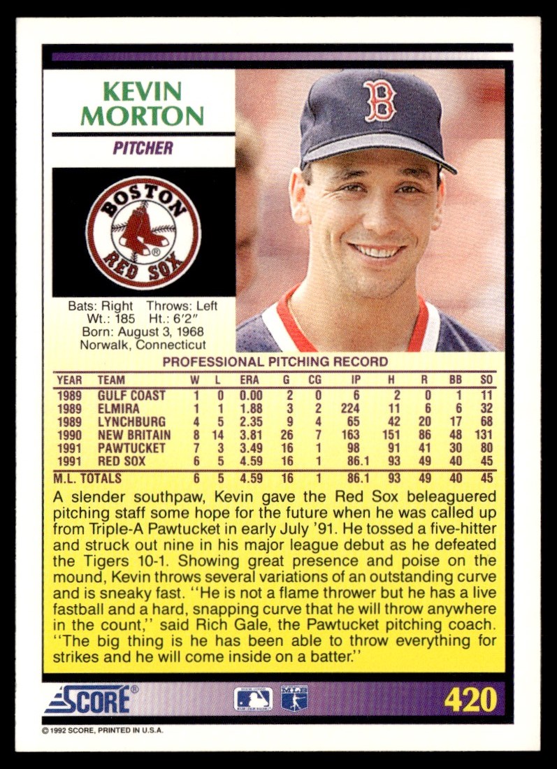 1992 Score Kevin Morton Rookie Boston Red Sox #420