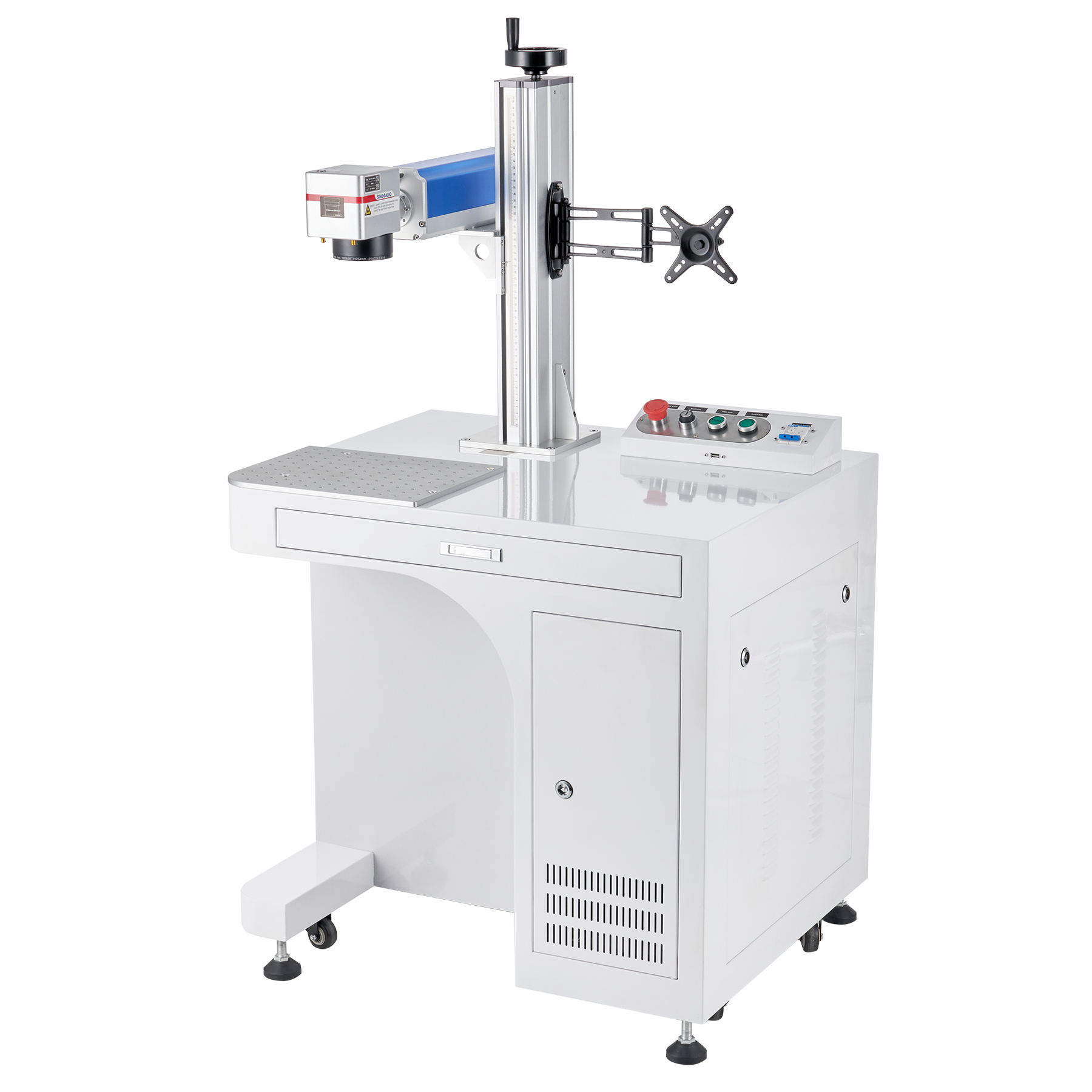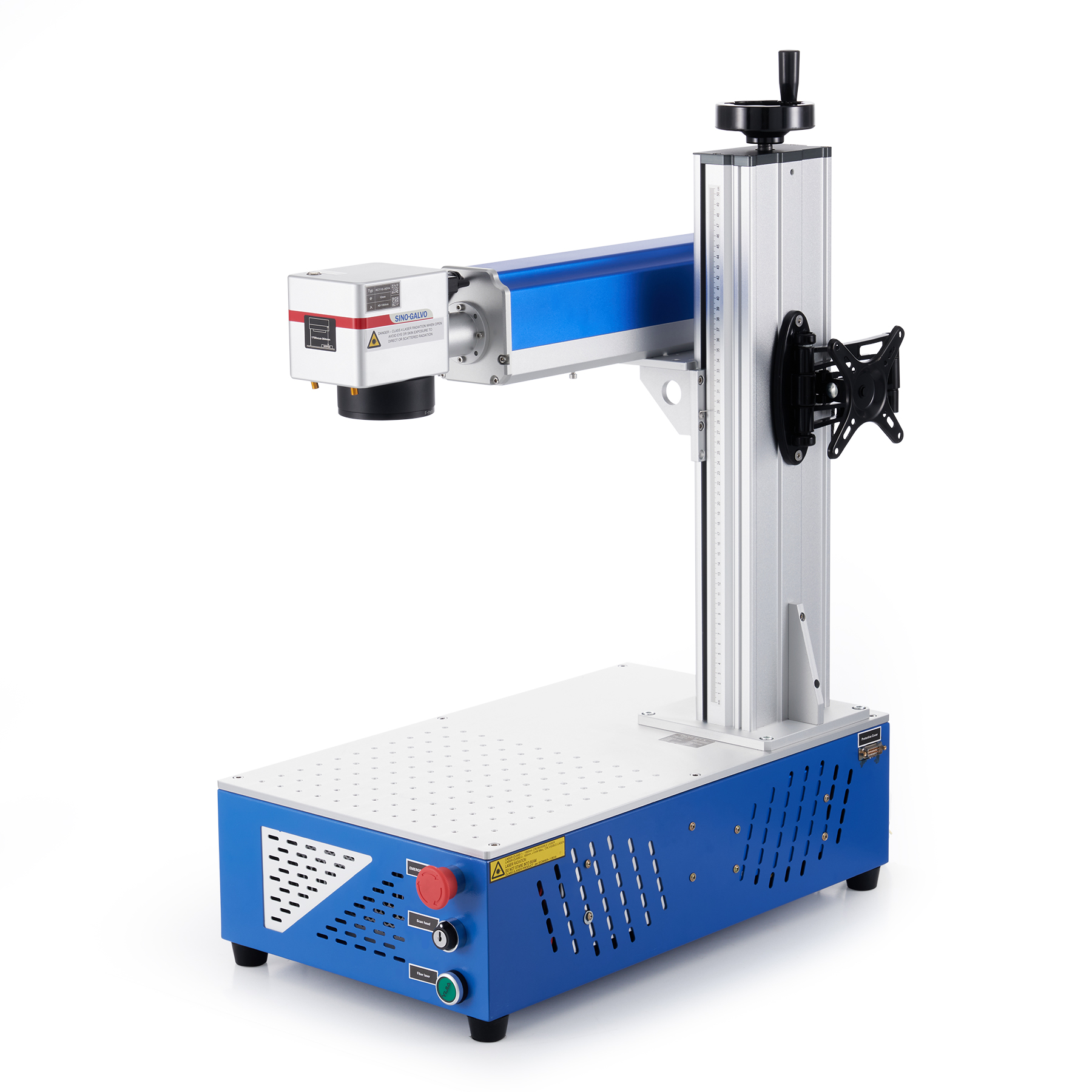 The laser arm's Sino-Galvo drive and scanning system provides outstanding accuracy and works with the Fθ lens to produce both fast and stable marking of flat surfaces at speeds as fast as 275.6 inches per second (7000 mm/s).