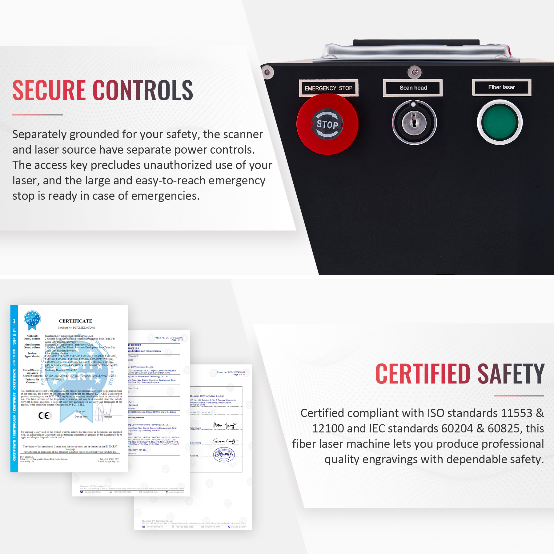 Separately grounded for your safety, the scanner, laser source, and rotary axis have separate power buttons. The access key precludes any unauthorized use of your laser, and the circuit breaker is ready in case of emergencies.