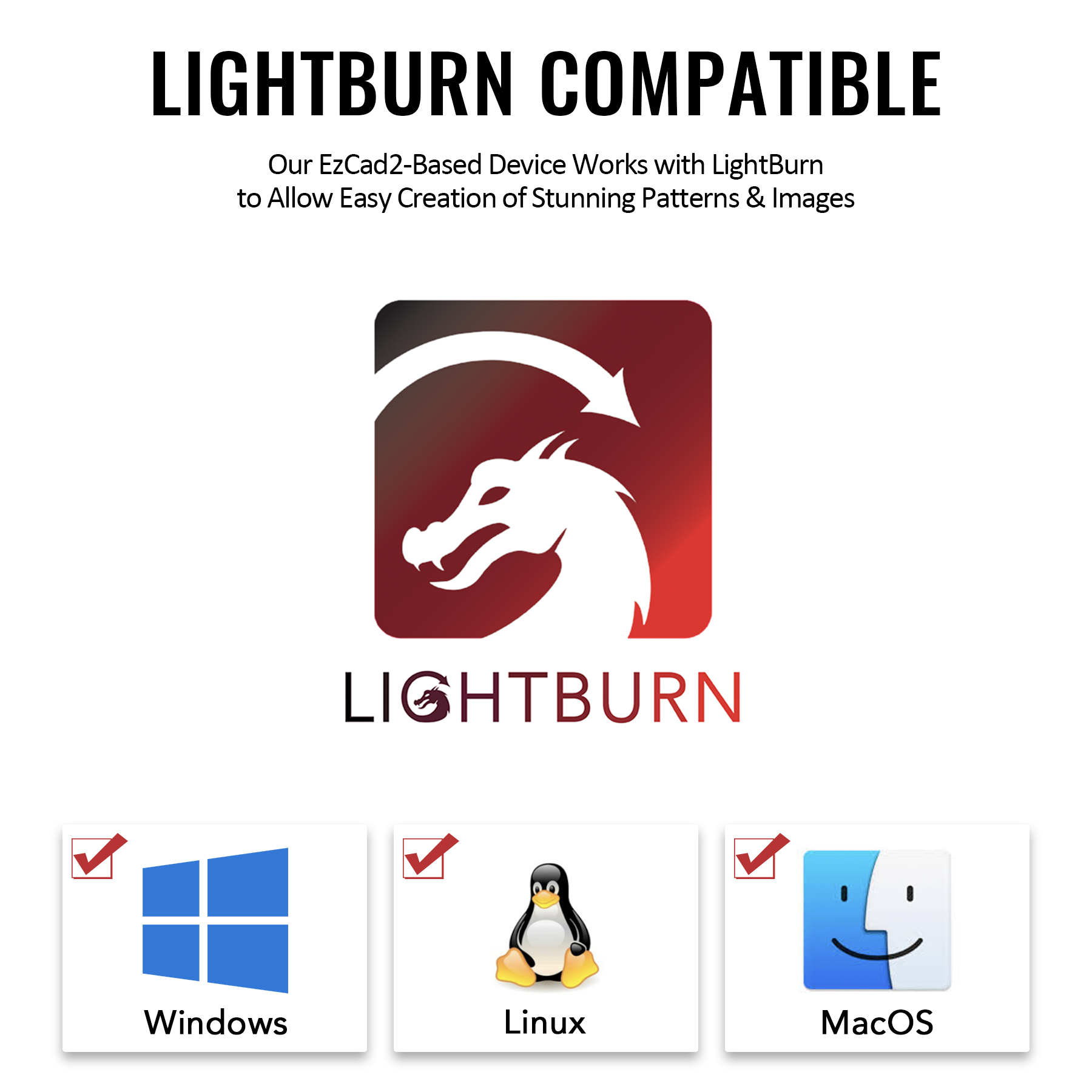 Your EzCad2-based fiber laser engraver works with LightBurn's latest galvo functionality on Windows, MacOS, and Linux systems to let you create even the most intricate patterns easily.