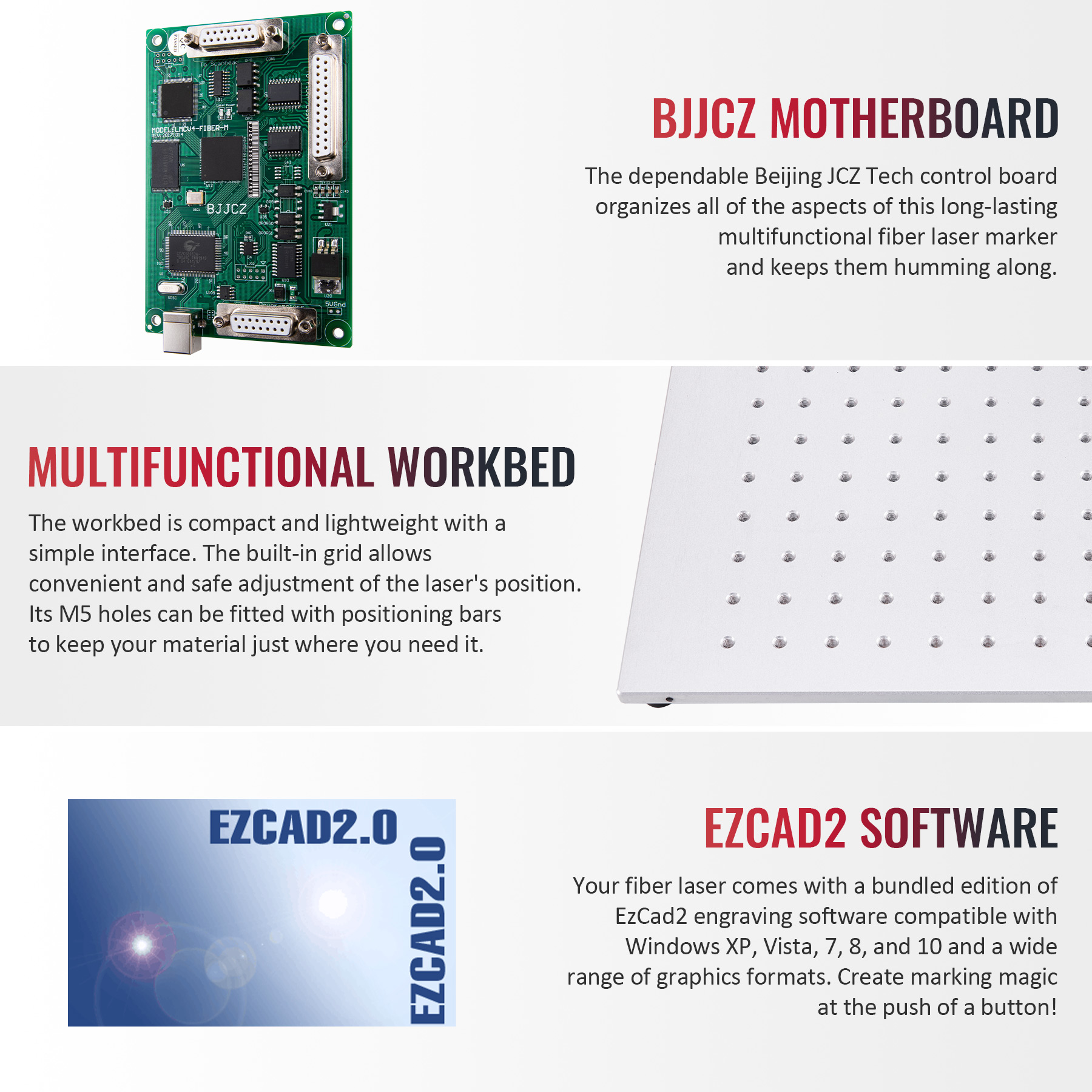 The dependable Beijing JCZ Tech control board organizes all of the aspects of this long-lasting multifunctional fiber laser marker and keeps them humming along.