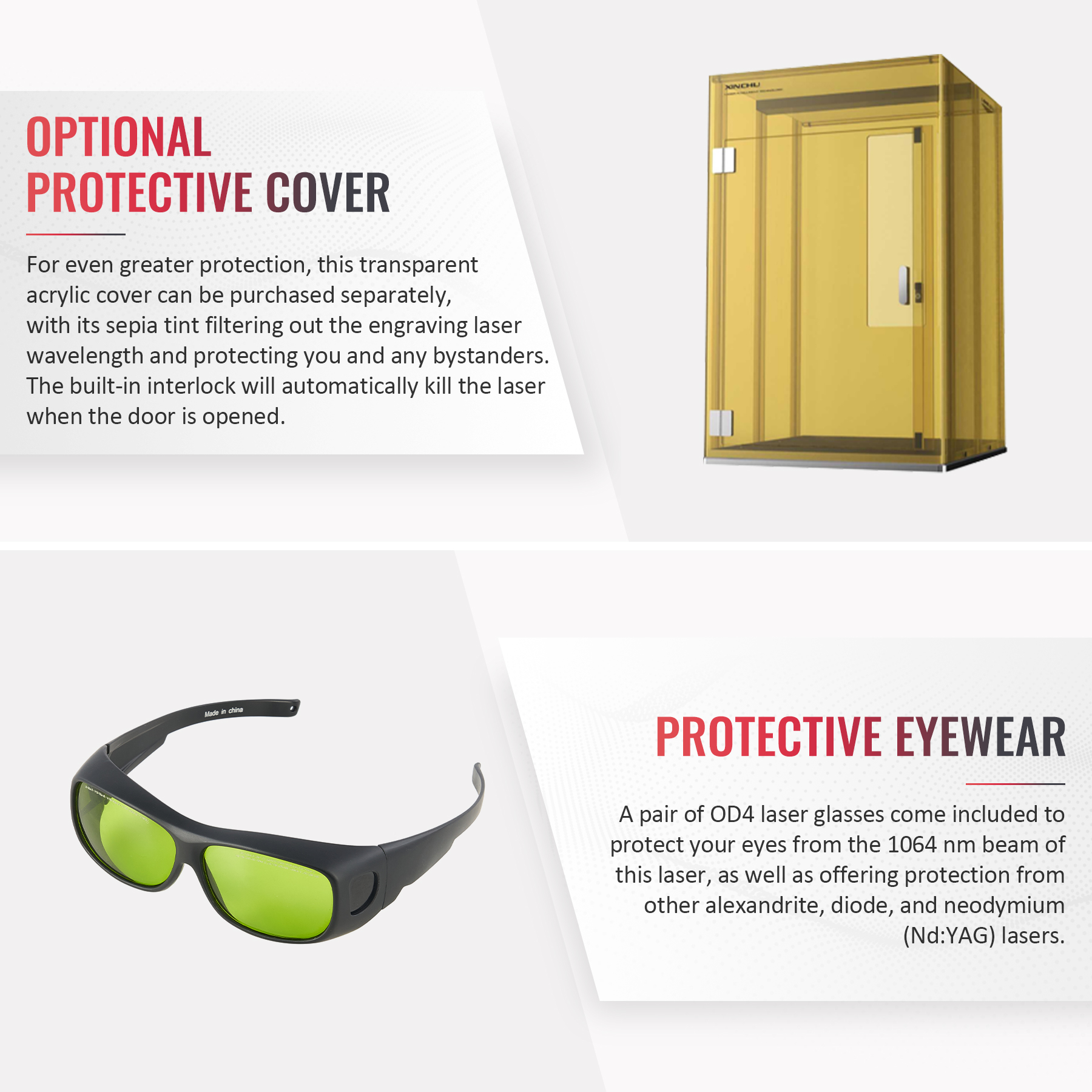 NOTE that this device has an open workbed. It comes with one pair of protective eyewear, but anyone else in the room with the device should also have their own laser glasses to avoid any possibility of injury from its beam.
