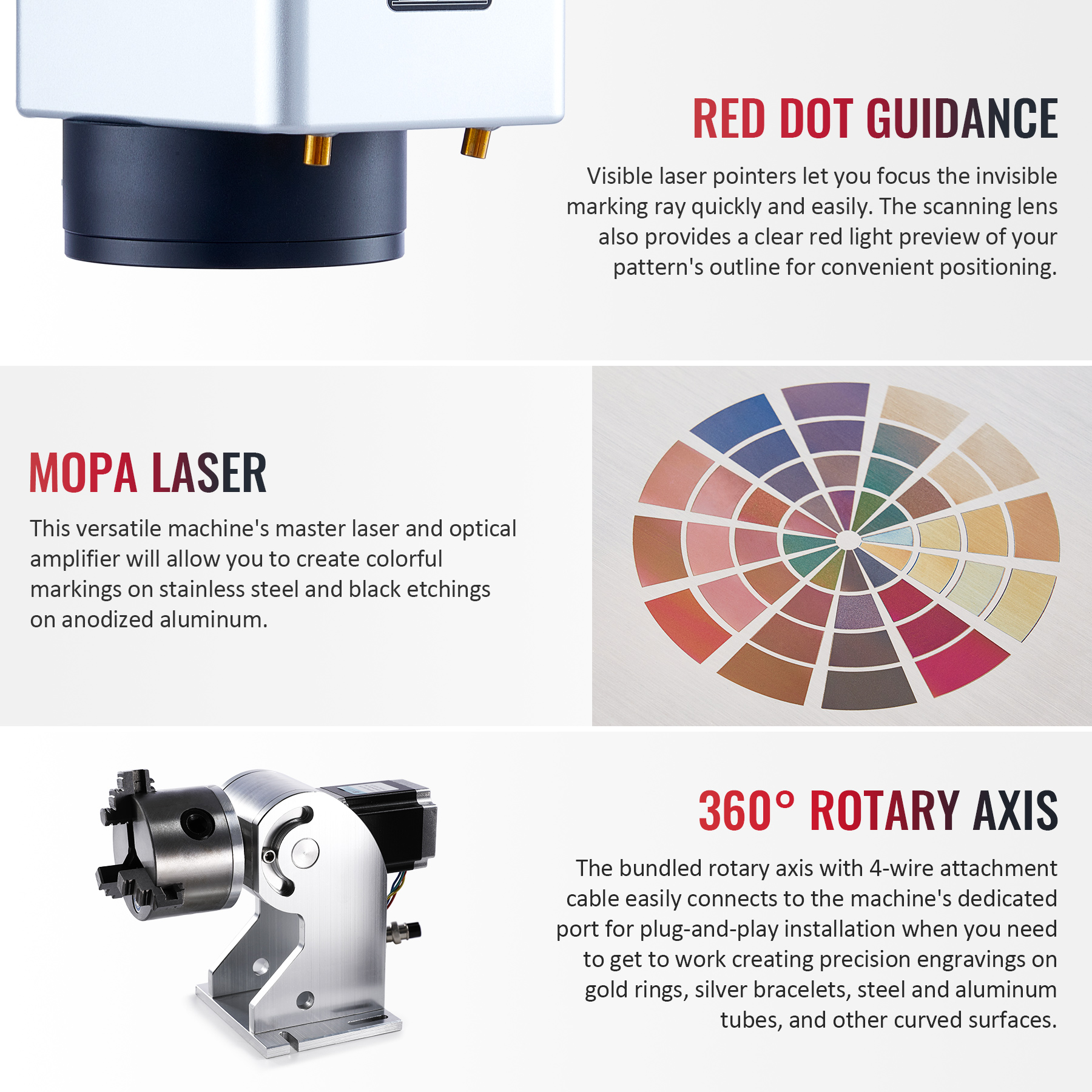 The bundled 360° rotary axis provides precision engravings on gold rings, silver bracelets, steel & aluminum tubes, and other curved surfaces.