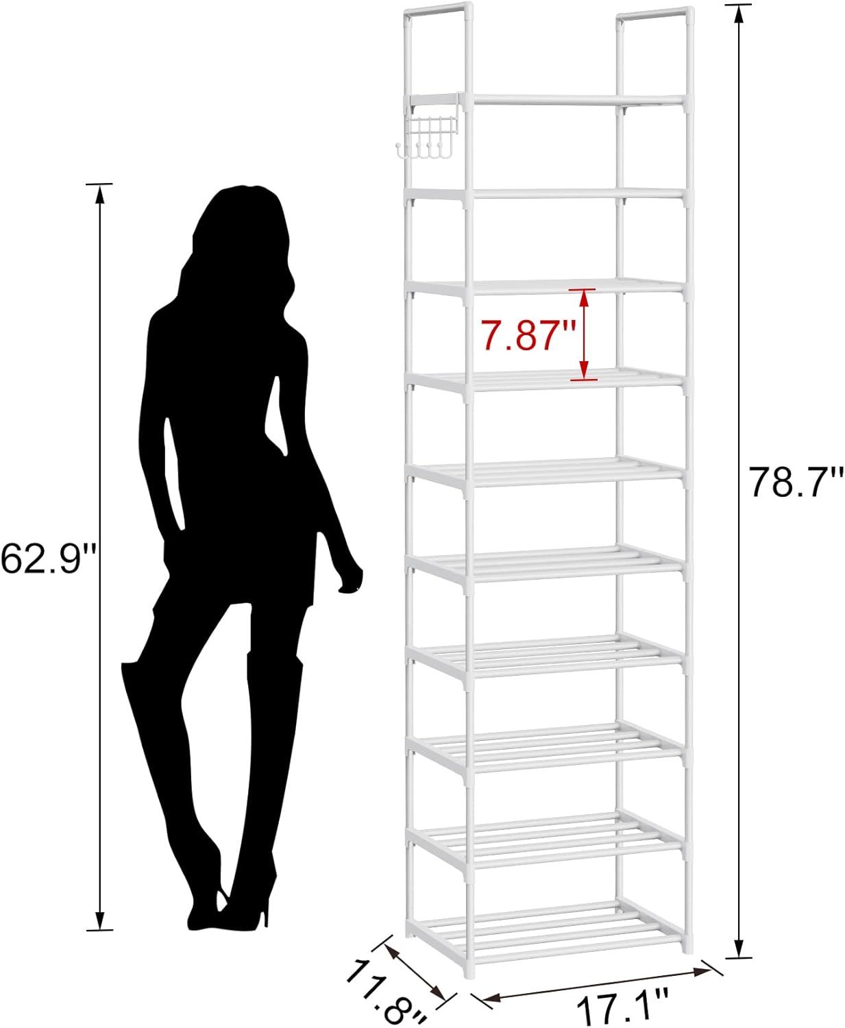 LAR ACITY 10 TIERS NARROW SHOE RA : The WEXCISE narrow shoe ra shelf has the size for small space,and metal shoe ra tier shoe ras can stora more pairs of shoes. It can store up to 20-24 pairs of shoes. Freely assemble to chan the height,the height of a single layer is about 7.87 inches,you can disassemble one layer and make it into a high grid to place your tall boots. Metal vertical shoes stora cabinets can maximumly save space and provide a cozy and tidy home.