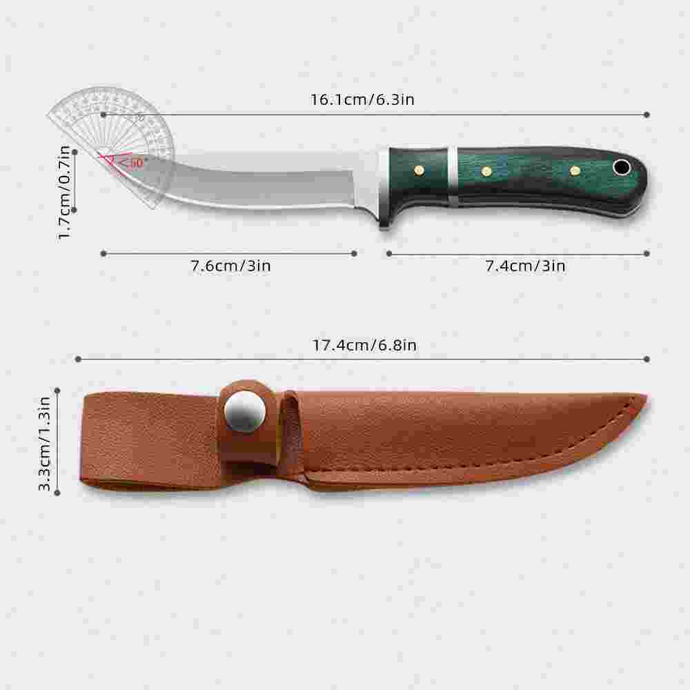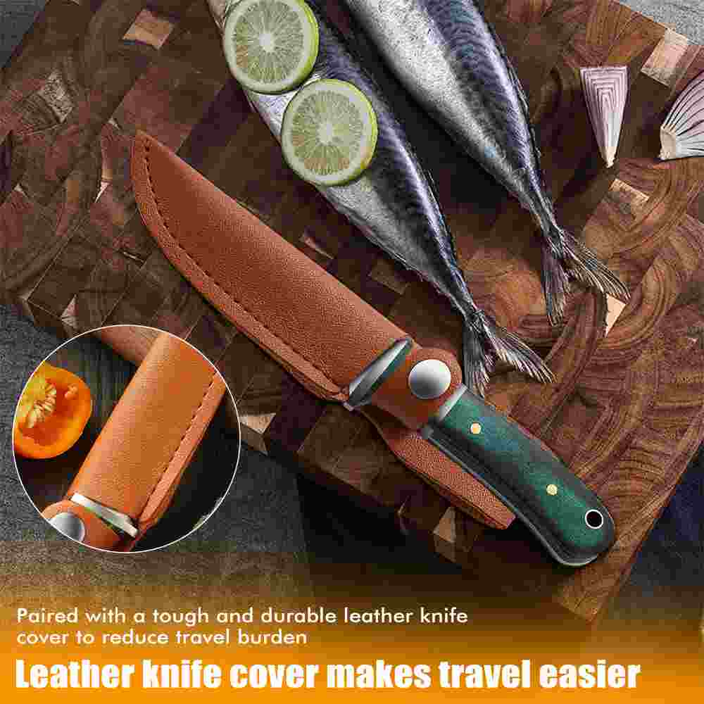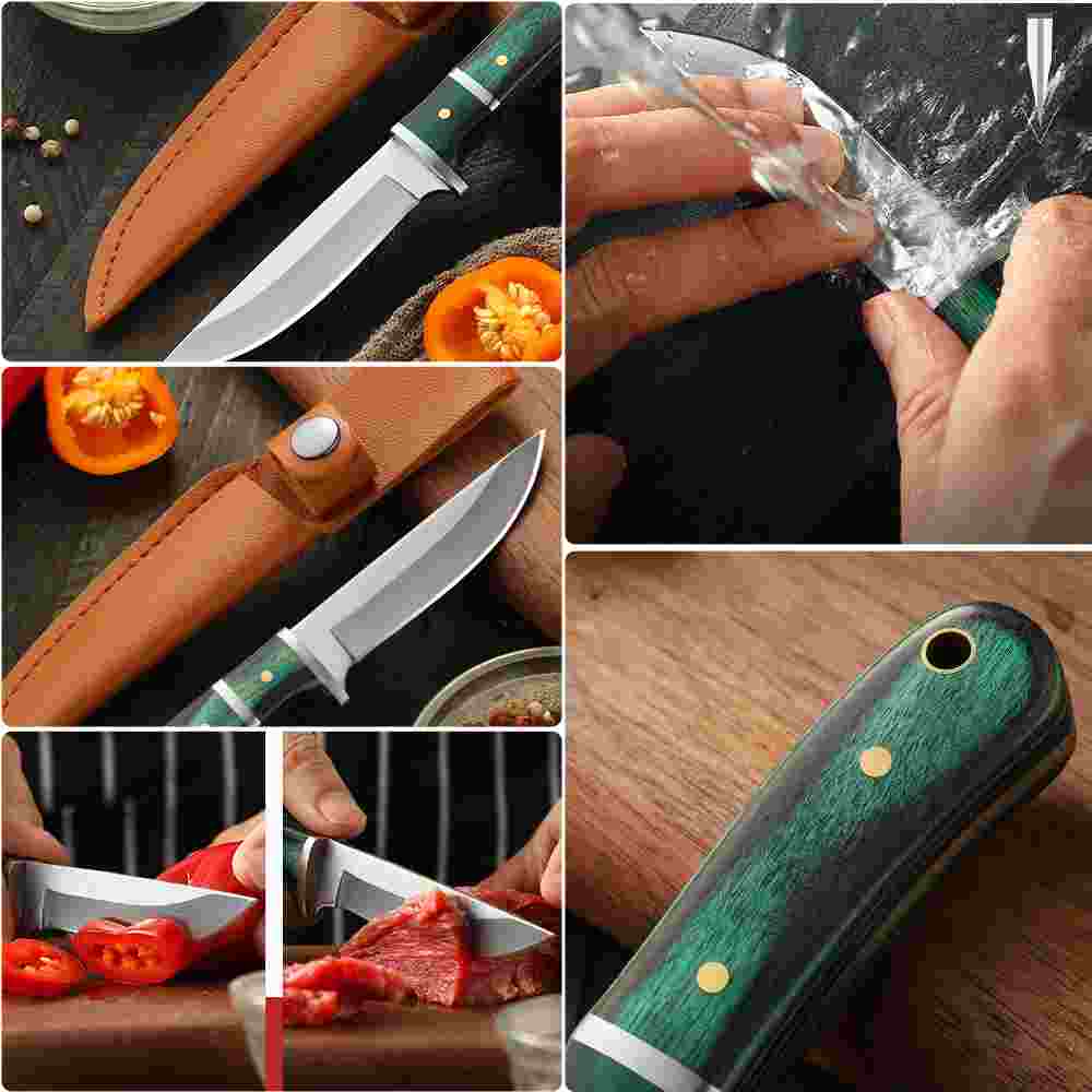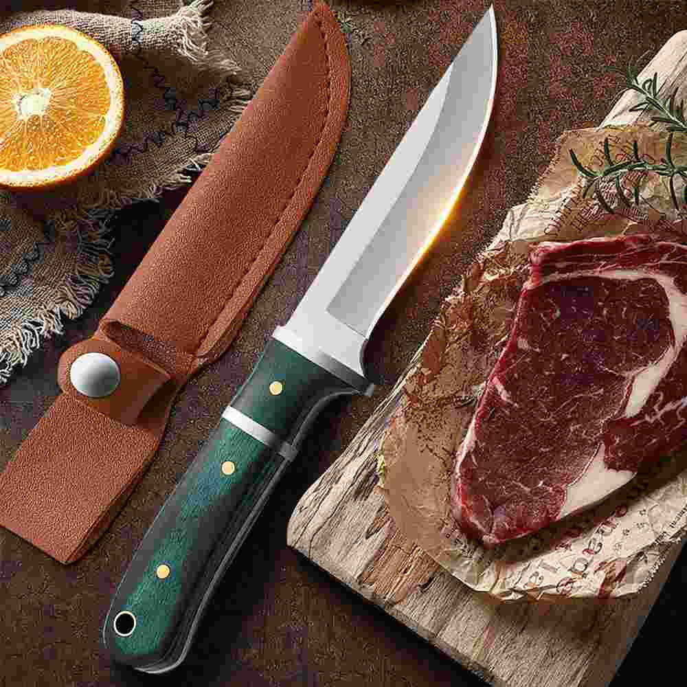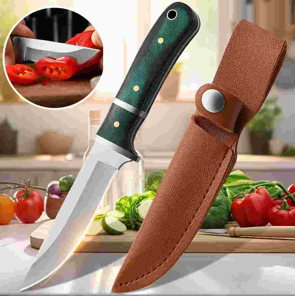 Hochwertige Edelstahlklinge: Die scharfe Klinge aus rostfreiem Edelstahl bietet ausgezeichnete Schneidleistung und Haltbarkeit, ideal für das präzise Schneiden von Fleisch, Gemüse und mehr. Ergonomischer Holzgriff: Der grüne Holzgriff mit drei goldenen Nieten sorgt für einen sicheren und komfortablen Griff, auch bei nassen Händen. Die Öse am Ende ermöglicht einfaches Aufhängen zur Aufbewahrung. Schutzlederscheide inklusive: Die mitgelieferte Lederscheide mit Druckknopf schützt die Klinge vor Beschädigungen und ermöglicht sicheres Tragen bei Outdoor-Aktivitäten. Multifunktionaler Einsatz: Perfekt als Küchenmesser für die Zubereitung von Steak und Fleischgerichten, sowie als Outdoormesser für Camping, Wandern, Angeln und Jagd. Langlebig und pflegeleicht: Die glatte Oberfläche ist leicht zu reinigen und widerstandsfähig gegen Rost und Abnutzung. 🌱 Einsatzbereiche Küche: Ideal zum Zerlegen von Fleisch, Schneiden von Steak und Gemüse. Outdoor: Perfekt für Camping, Wandern, Angeln und Jagd. Tragekomfort: Mit der Lederscheide einfach am Gürtel zu tragen. ⚠️ Wichtiger Hinweis Dieses Messer ist nur für erwachsene Nutzer (ab 18 Jahren) bestimmt. Es dient ausschließlich als Werkzeug für Küchen- und Outdoor-Zwecke und nicht als Waffe. 📦 Lieferumfang 1 x Feststehendes Messer 1 x Lederscheide