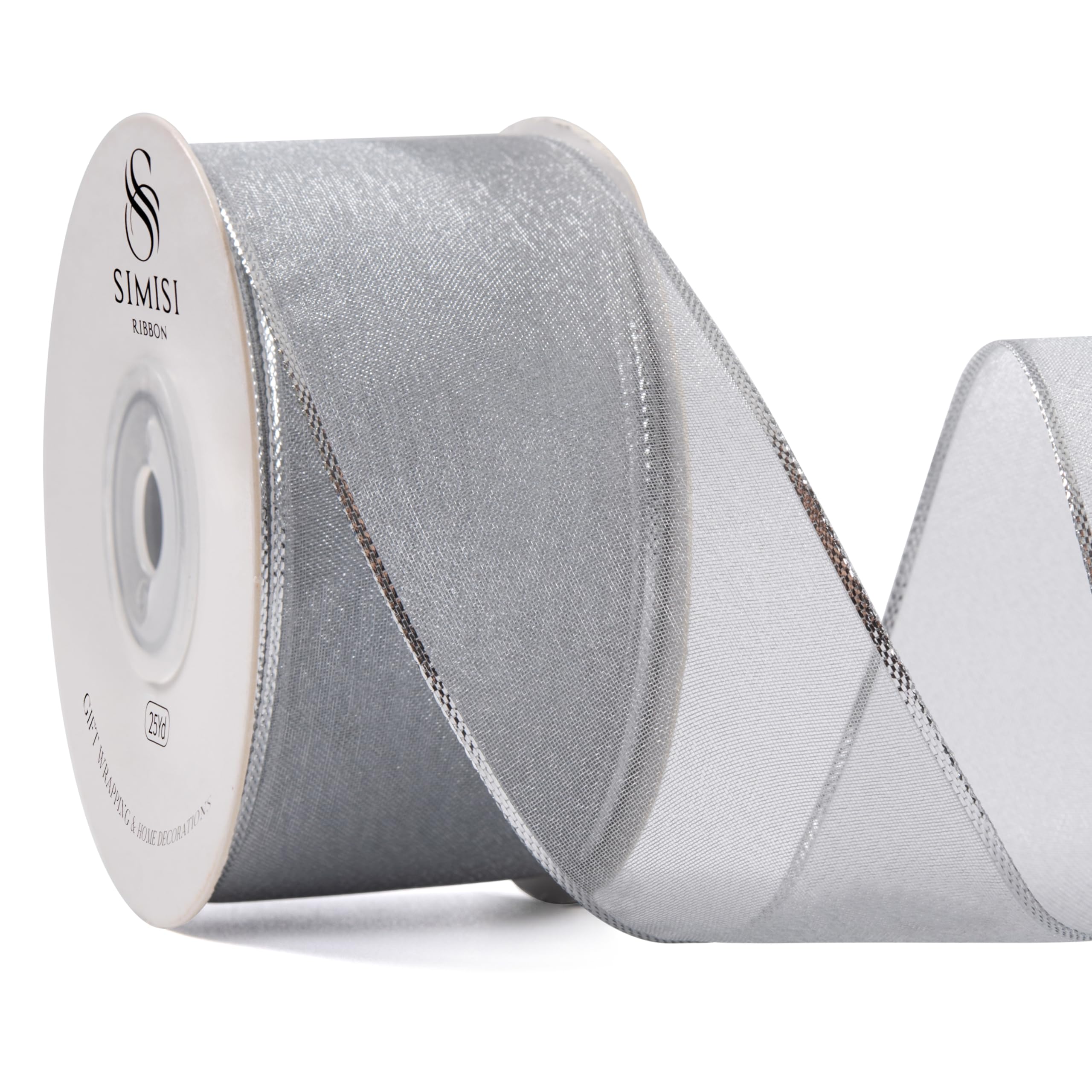 Sliver Christmas Ribbon Wired Sheer Organza Ribbon with Gold Sliver Border for Christmas Tree, 1.5 Inch 25 Yards