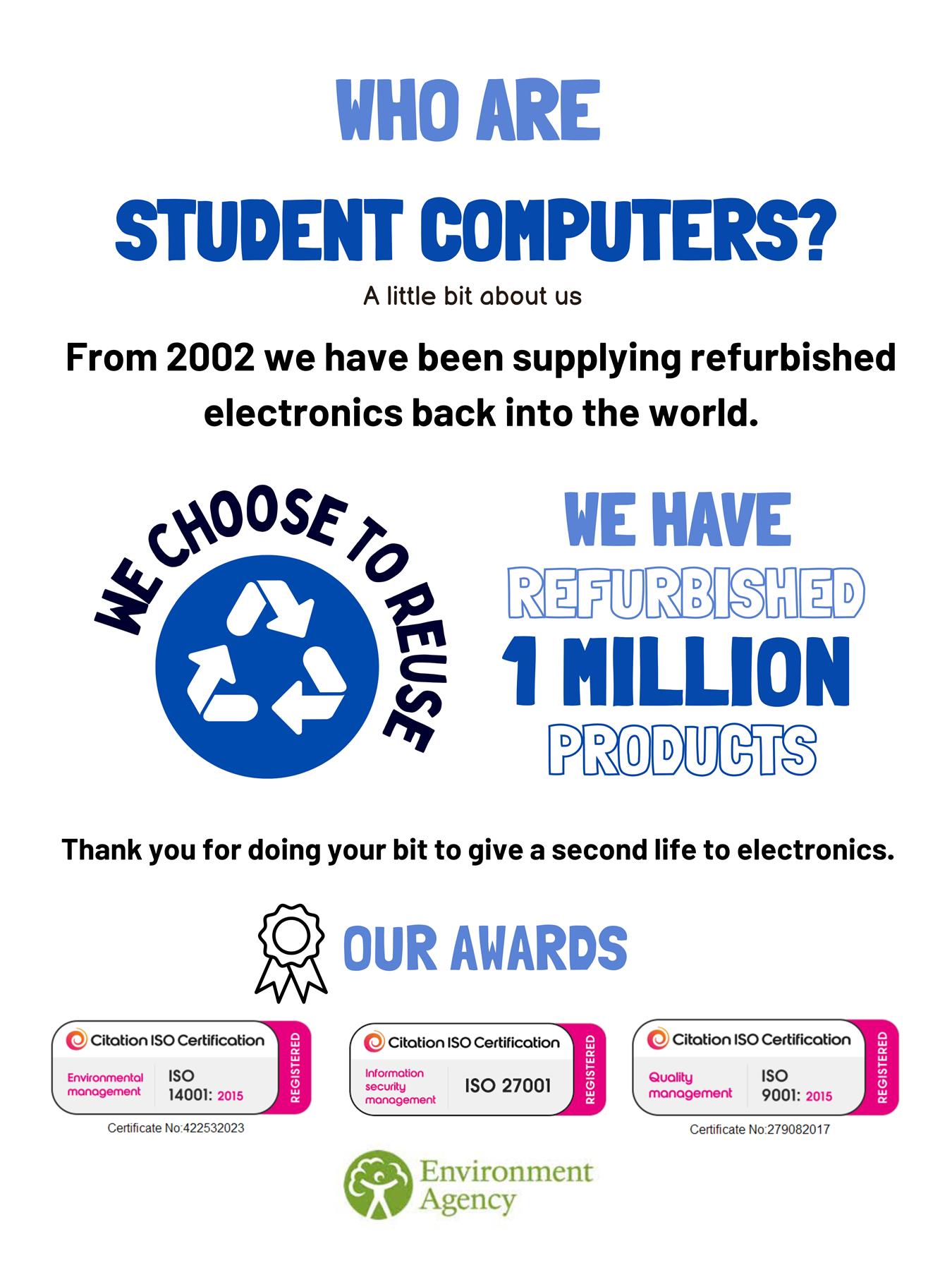 Student Computers is a reputable and established online retailer that has been providing customers with new and refurbished electronics since 1996. As one of the UK's most competitive online retailers, we offer a wide range of high-quality products, from laptops and desktops to tablets and smartphones, at highly competitive prices. Our success in the industry is a testament to our commitment to delivering exceptional products and services to our valued customers.