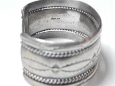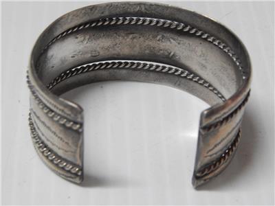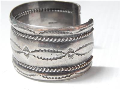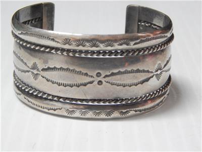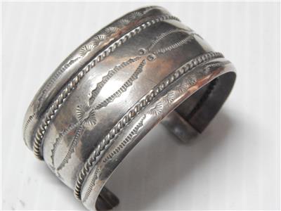 COMMENTS: A classic look to this wonderful vintage ingot sterling silver Navajo bracelet with a vast amount of hand stamped designs as well as two sections of twisted sterling silver wire. A GREAT LOOK AND A GREAT OLD BRACELET that is fit for any sex or age and will be noticed each time you wear it and it has