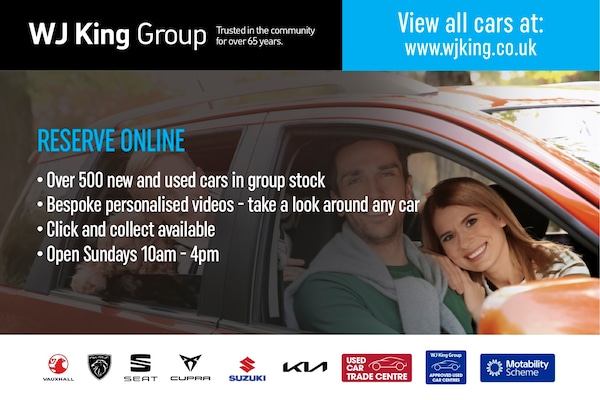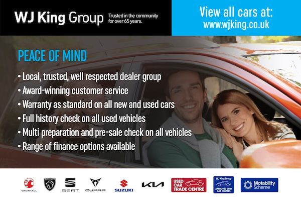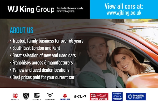 WJ King is one of the South East and Kent largest privately owned Motor Group, across award-leading manufacturers incorporating Vauxhall, Peugeot, Kia, SEAT, Cupra and Suzuki. Whether you're looking for a nearly new or used vehicle, it is our aim to provide our customers with an unrivalled service tailored to suit their personal requirements. With up to 1000 vehicles in stock at any time, you can be sure we will have something to suit your requirements.