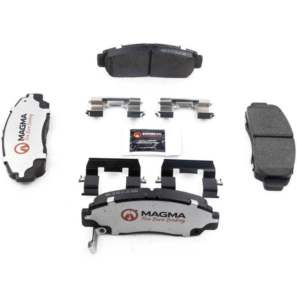 WHY MAGMA? - Today's harsh stop and go environment can create very high heat levels in your braking system which can reduce the vehicle's ability to stop. Extreme high temperatures can be reached in many braking situations such as - Stop and Go Traffic, Mountain Driving, Hauling or Towing, Emergency Stops, Spirited Driving and Long, Sustained Braking. At MAGMA Brakes, we use FIRE to fight FIRE. Our brake system components are made using advanced, state of the art techniques and treatments that ensure our brakes will stand up to the heat.MAGMA Pro-Series brake pads feature...1. Scorched, copper free friction formulations for overall ltimate braking performance2. Vulcanized OE style rubber core shims for unsurpassed noise suppression3. Heat-tempered upgraded dual-coated stainless steel hardware kits to restore the brake pad to caliper interface to ""like new"" condition (where applicable)4. Heat expansion OE style slots and chamfers to dissipate noise and stand up to the heat5. High-heat resistant brake lubricant included for lubricating critical points during pad installation