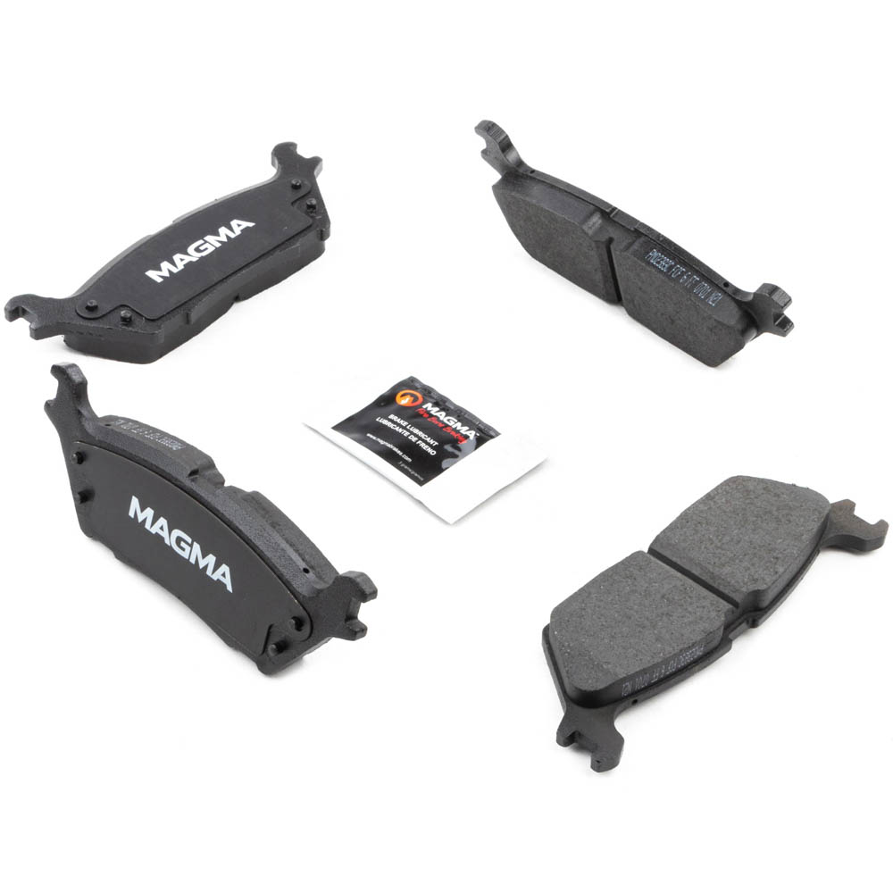 WHY MAGMA? - Today's harsh braking environments can create very high heat levels in your braking system which can reduce the vehicle's ability to stop. Extreme high temperatures can be reached in many braking situations such as - Stop and Go Traffic, Mountain Driving, Hauling or Towing, Emergency Stops, Spirited Driving and Long, Sustained Braking. At MAGMA Brakes, we use FIRE to fight FIRE. Our brake system components are made using advanced, state of the art techniques and treatments that ensure our brakes will stand up to the heat.MAGMA Premium brake pads feature...1. Scorched, copper-free friction formulations for optimal stopping power2. Heat-treated rubberized multi-layer shims for superior noise dampening3. Heat-tempered stainless steel hardware kits to restore the brake pad to caliper interface (where applicable)4. High-heat resistant brake lubricant included for lubricating critical points during pad installation