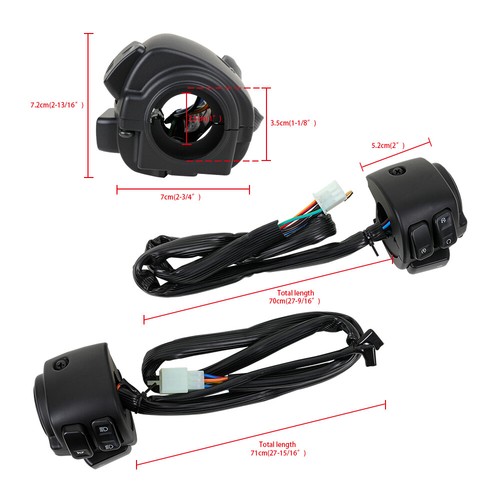 Features: 【Perfect fit】All-in-1 design.It stay firmly with the handlebar with left side and right side. 【Material】Made of premium plastic and metal, it is weatherproof and very durable in using. 【Install】Easy to install, but wiring modification might be needed, and professional installation is highly remended. Specification: Condition: 100% Brand New Diameter Of Hole: 1'' (25mm) Cable Length: 28'' (71cm) Color: Black housing, black button Voltage: DC 12V Material: Aluminum Housing, plastic button Fitment: patible With Harley Softail, Dyna, Sportster, V-ROD 1996-2012 that is with 1" handlebars. Package Content: 2x Motorcycle Handlebar Headlight Horn Turn Signal Light Switch with harness