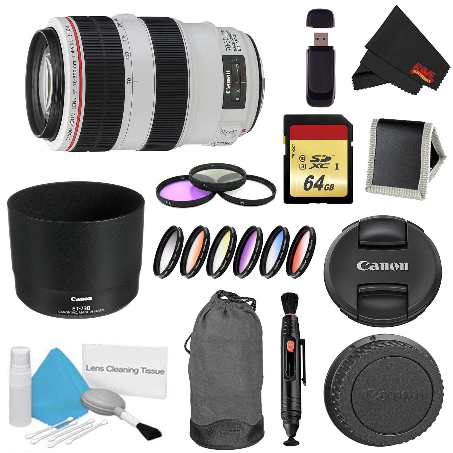 - 1 x Canon EF 70-300mm f/4-5.6L IS USM Lens (International Model) | 1 x 64GB UHS-I SDXC Memory Card (Class 10) | 1 x 67mm Graduated Color Multicoated 6pcs Filter Set | 1 x 3 piece Filter Kit | 1 x Lens Pen | 1 x Memory Card Reader | 1 x Lens Cleaning Kit | 1 x Memory Card Wallet | 1 x Microfiber Cloth