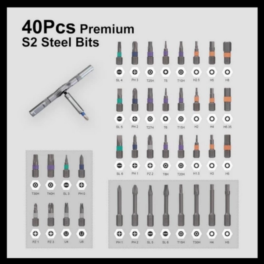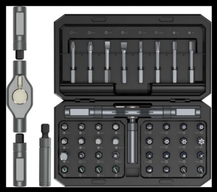 Flexible Ratchet Handle Design - The handle features a detachable structure, allowing for various combinations and multifunctional adjustments to fit different situations, like using in narrow spaces. The ergonomic aluminum handle design is lightweight yet rugged, crafted from hot-forged aluminum alloy with high-precision CNC molding for durability and oxidation resistance. Its lightweight construction ensures ease of handling, making it perfect for extended use without fatigue. Effortless Ratcheting Mechanism - Equipped with a 6.2-degree ratchet and 58-tooth forward-reverse ratchet mechanism, offering 80% effort savings. With a 50N.m torque, ratcheting screwdriver set tool makes it simple to tighten or loosen screws without wrist adjustments, saving time and effort in every repair job. 42-in-1 Screwdriver Set - handy screwdriver set includes 40PCS S2 magnetic chromium-molybdenum alloy steel bits, featuring a 6.35mm (1/4") diameter, one handle, and a magnetic slot. the bit driver set comprises 32 short bits (25mm) and 8 long bits (45mm), including various types like PH, SL, Torx, Hex, PZ, and U-shape. Ideal for home, work, DIY projects, professional task, and repairs, providing the right tool for any task. Strong Magnetic & Easy Identification - Features a magnetic handle for secure bit placement and a convenient magnetic slot within the case to recharge the bitsβ magnetism as needed. Color-coded bit rings ensure quick and easy identification, improving work efficiency and simplifying organization. This magnetic screwdriver set effectively tackles various tasks, including home appliance repairs, home furniture repairs, and automotive maintenance. Compact Case, Perfect Gift Choice - Housed in a sturdy, compact storage case (6.6 x 3.7 x 1.6 inches, 15.6 oz), this mini screwdriver set is an excellent gift for professionals and DIY enthusiasts alike. Whether for furniture, electronics, appliance, computers, motorcycle or bike repairs, it's a practical present for Christmas, holidays, birthdays, Father's Day or any special occasion.