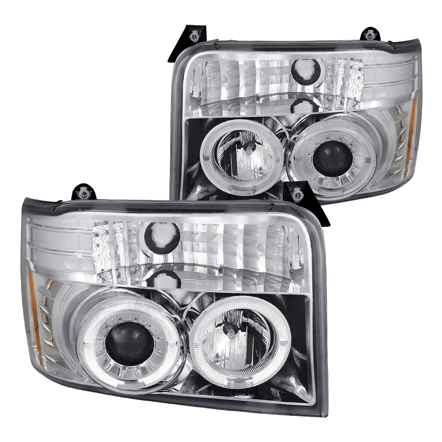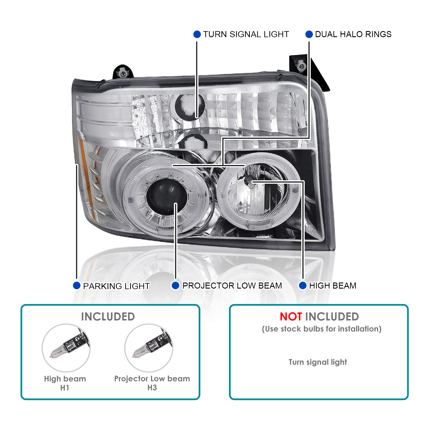 Brand new in original packaging. Exactly the same as shown in the picture! Comes with both headlights. Light bulbs included for HIGH (H1) /LOW (H3) beam. High quality chrome projector headlights w/ dual halo rings These lights are made by an OE approved and ISO certified manufacturer with the quality meet or exceed all OE standards. Do not come with installation instructions. Professional installation highly recommended. Fitment : 92-96 Ford F-150 / F-250 - F-350. 92-96 Ford Bronco.