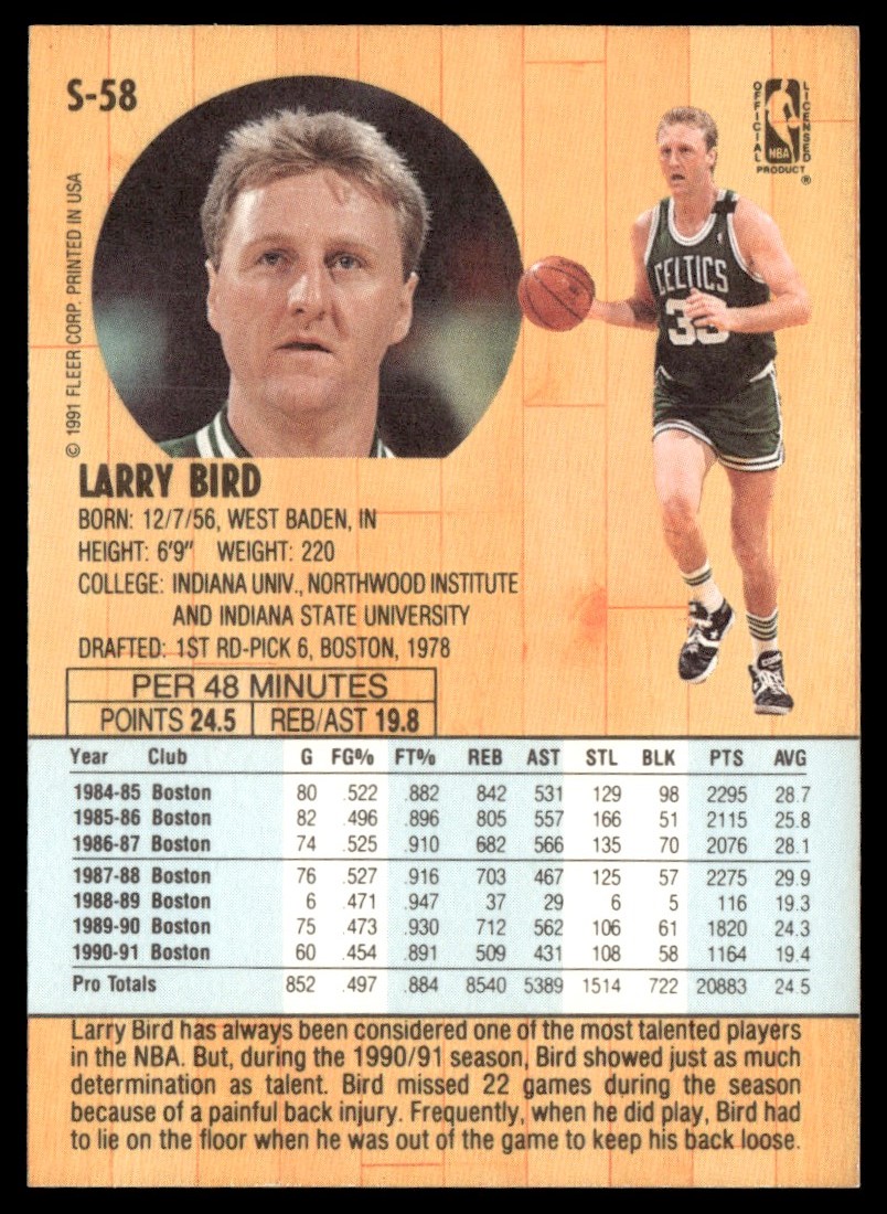 1991-92 Fleer Tony's Pizza Larry Bird Boston Celtics #S-58