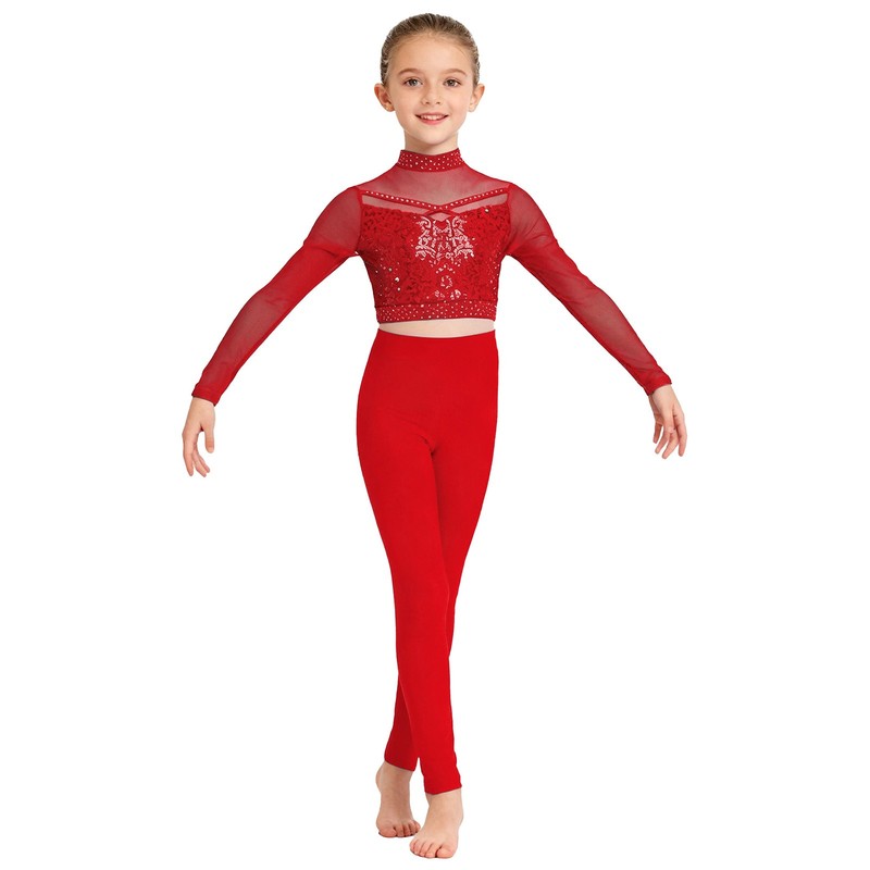 The mesh patchwork and shiny sequins on the crop top create a dazzling and eye-catching effect, making the little girl stand out on the stage.