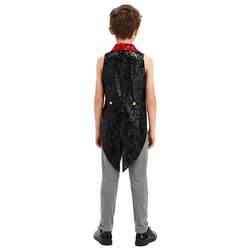 A medieval victorian vest circus costume for child size, is designed with lapel, v neck, high-low hem and front zipper closure.