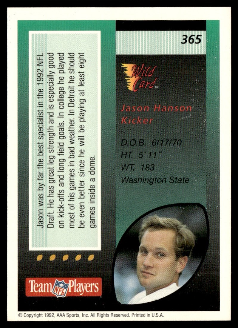 1992 Wild Card Jason Hanson Rookie Detroit Lions #365