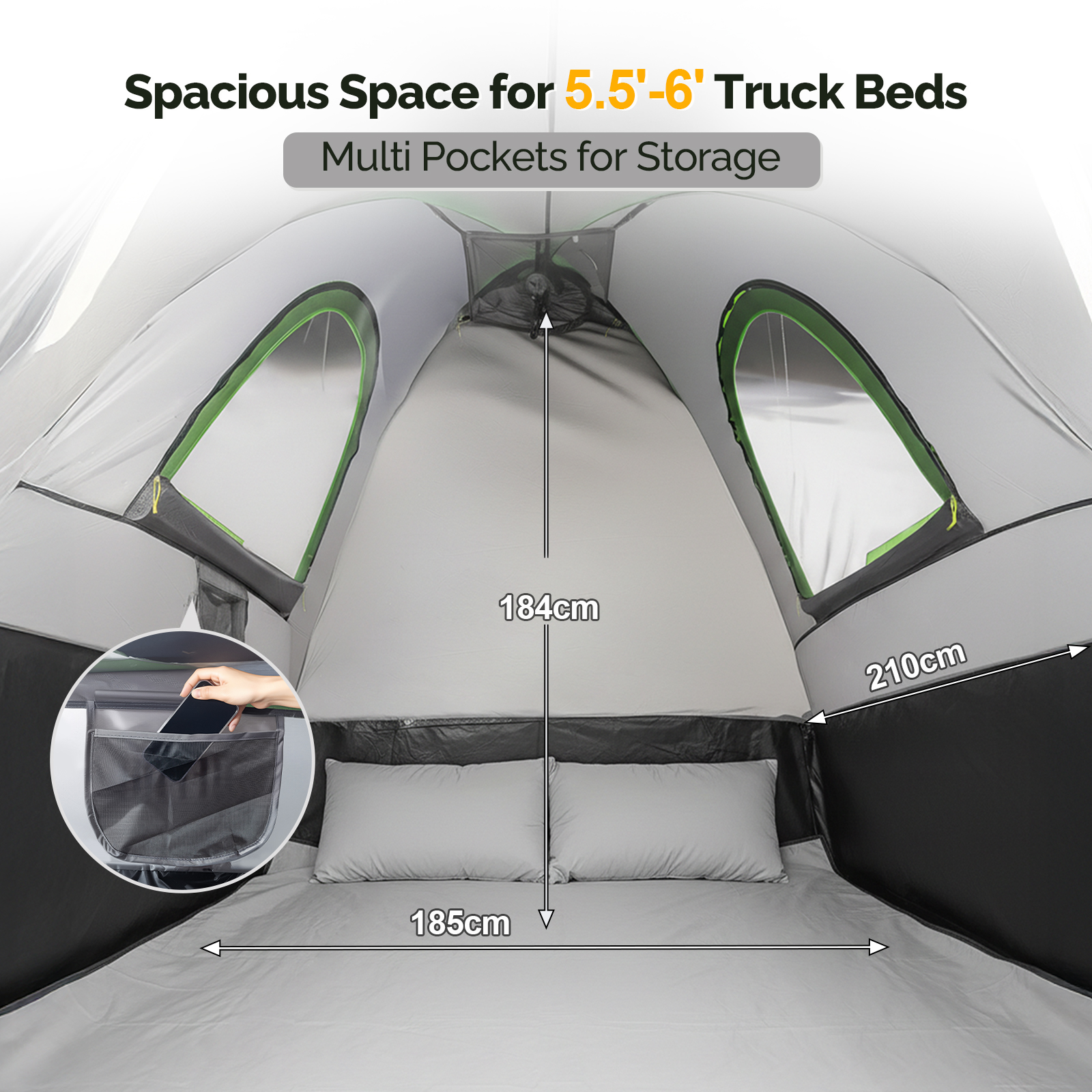 【Double-layer Waterproof Material & Rainfly】: pickup truck tent made of 210D polyester oxford, with PU2000 water-proof coating, rainproof and waterproof. The bottom of the tent has a waterproof layer to avoid rainwater infiltration, can be placed in the air-filled bed, the inner space always keeps clean and dry