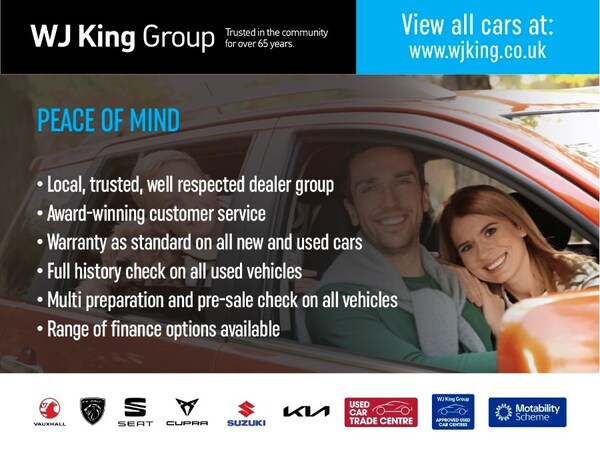 WJ King is one of the South East and Kent largest privately owned Motor Group, across award-leading manufacturers incorporating Vauxhall, Peugeot, Kia, SEAT, Cupra and Suzuki. Whether you're looking for a nearly new or used vehicle, it is our aim to provide our customers with an unrivalled service tailored to suit their personal requirements. With up to 1000 vehicles in stock at any time, you can be sure we will have something to suit your requirements.