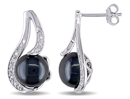These Stud Earrings will be the perfect gift for any occasion. Crafted in lustrous sterling silver, the earrings feature beautiful black button freshwater pearls (9-9.5mm) with 16 round-cut, pave-set white diamond accents (G-H, I3) on its sides. These earrings are secured with butterfly back closures.