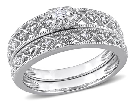 Add a subtle sparkle to your ensemble with the Amour Collection Diamond Vintage Bridal Set. Crafted in lustrous sterling silver and features a round-cut, prong-set diamond studded at the center of the band with ten round-cut, pave-set diamonds (G-H, I2-I3) studded on both engagement and wedding band in vintage style. Buffed with luster this glamorous and sparkling bridal set is the perfect addition to any jewelry collection. Give yourself a stylish look with this trendsetting bridal set.