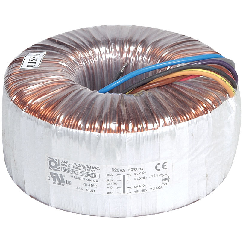 Specifications: • Primaries: 115V + 115V • Frequency: 50/60 Hz • Load Capacity: 625 VA • Secondary Voltage: 25V + 25V • Dimensions: 5.4" D x 2.6" H • Weight: 10.8 lbs.