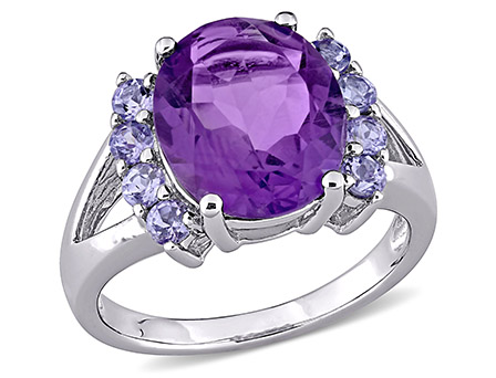 Look extraordinary with this enchanting Amour Collection Amethyst and Tanzanite Split Shank Ring. Mounted in lustrous sterling silver it features an oval-cut, prong-set amethyst gemstone (12 x 10mm) studded at the center flanked by eight round-cut, prong-set flickering tanzanite gemstones. Polished to a brilliant shine, this ring is the perfect addition to any jewelry collection. Add some colors to your outfit with this gorgeous ring.