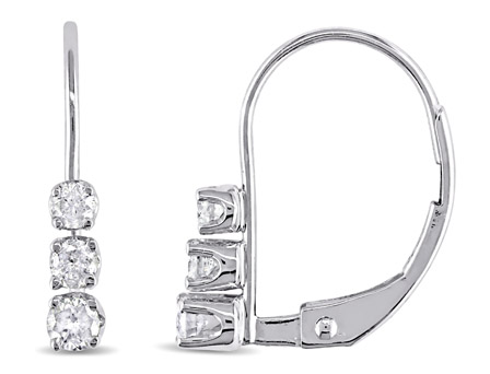 Present your loved with these classic Amour Collection Diamond Three-Stone Dangle Earrings in lustrous White Gold. The earrings feature 6 graduated round-cut, prong-set white diamonds (G-H, I3) and are secured with leverback closures.