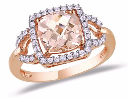 Get the perfect evening accessory with this magnificent Amour Collection Morganite and Diamond Halo Ring. Crafted in luminous rose gold, this flawless ring features a cushion checkerboard-cut, prong set, morganite gemstone (8x8mm) and 42 round-cut, buttercup-set diamonds (G-H-I, I2-I3). Polished to a brilliant shine, this splendid ring will make you the trendsetter.