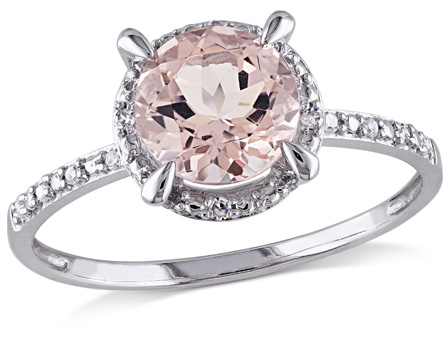 Show her how much you love her with this fascinating Amour Collection Morganite and Diamond Accent Halo Engagement Ring. Mounted in lustrous white gold, this ring features one round-cut, glittering morganite gemstone (7 x 7mm) at the center of the ring and 12 round-cut, shimmering diamonds (G-H, l2,l3) that are beautifully embellished on the ring using prong settings. Polished to a brilliant shine, this ring is a perfect addition to any jewelry collection. This ring has been enhanced with a beautiful milgrain finish and will add grace and elegance to any ensemble.