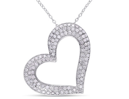 This eye-catching piece by Amour Collection features a full carat of dazzling diamonds. A total of 111 diamonds are set in rows on this unique heart design. The heart pendant is crafted in sterling silver and dangles slightly askew from the 18-inch cable chain.