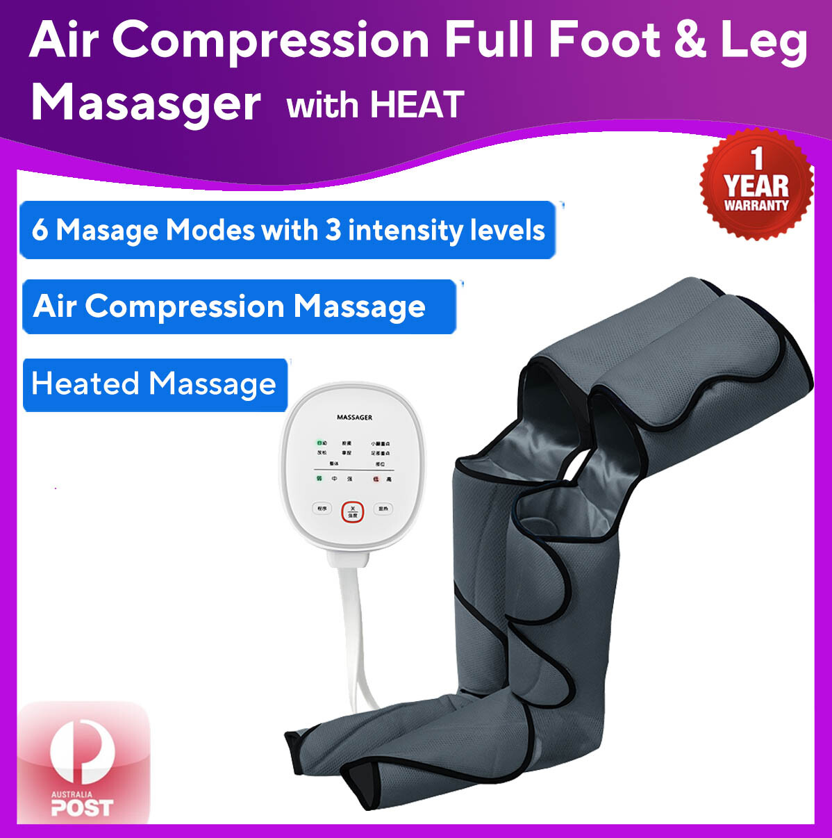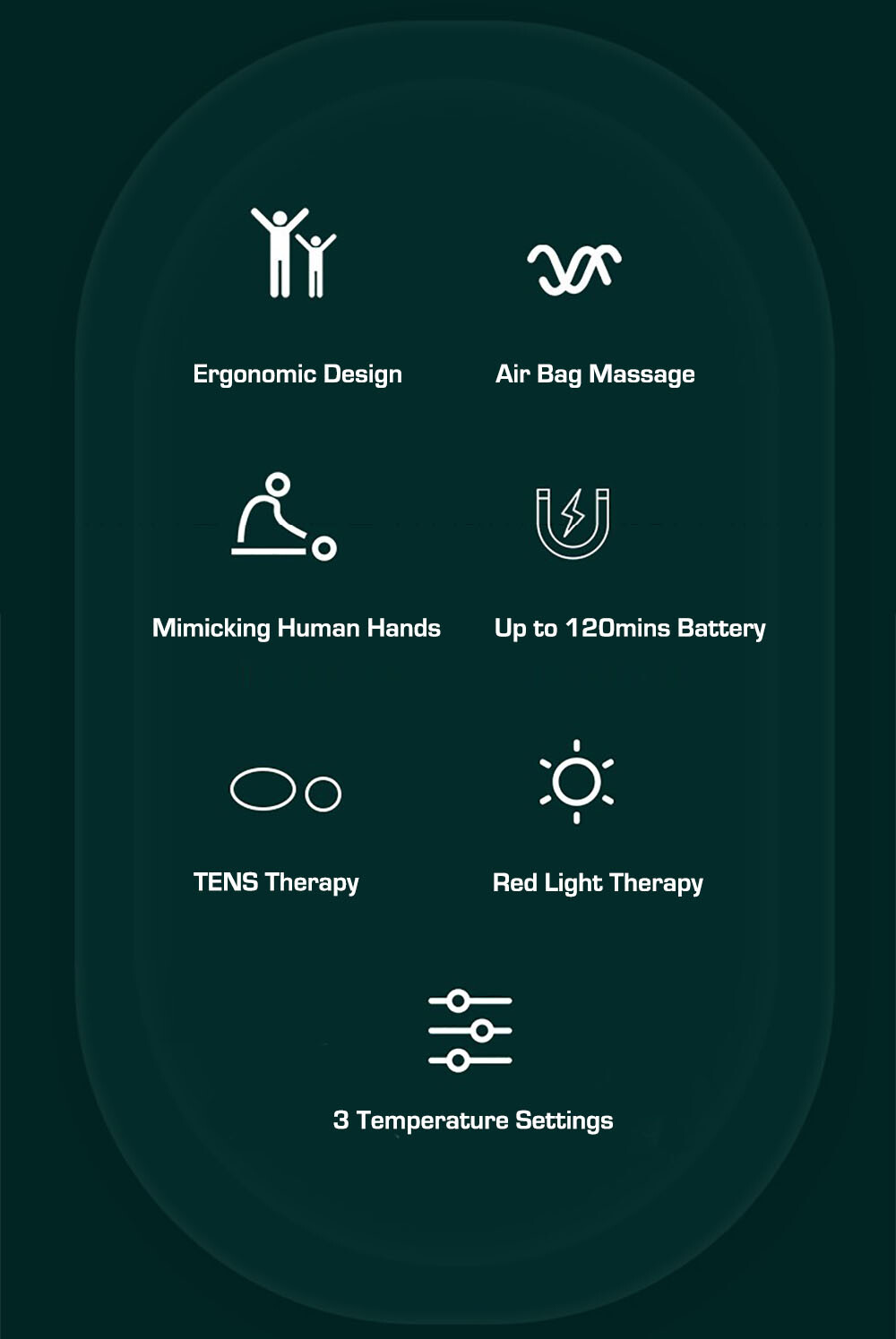 Fully wrapped Airbag compression massage, typically used in the massage chair is introduced into this massager. It can provide a compression massage that is different than kneading, rolling, or tapping. The side air bags stimulate the joint area in a wave-like motion by rapidly inflating and deflating which enhances blood circulation, loosens up muscle tension.