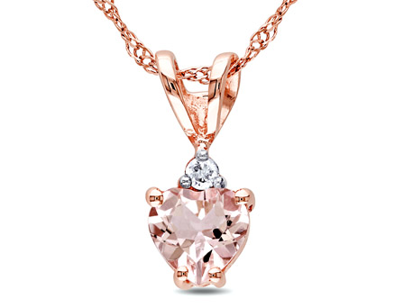 Elevate your look with this spectacular Amour Collection Morganite and Diamond Heart Pendant. Crafted in lustrous rose gold, this stunning pendant features a heart-cut (5mm) morganite gemstone and a round-cut, prong-set diamond accent (G-H, I2-I3). This pretty pendant is hung on a 17-inch rope chain and is secured with a spring ring clasp.