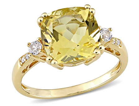 Get her the perfect gift this year with this Amour Collection Citrine and Created White Sapphire with Diamond Cocktail Ring. Crafted in yellow gold, the classic ring features a cushion-cut (10mm) citrine in the center with round-cut (2.5mm) and created white sapphires gemstone with Four round-cut, pave-set diamond accents (G-H, I1-I2) shimmering along the band. This ring is enhanced with a high polish finish.