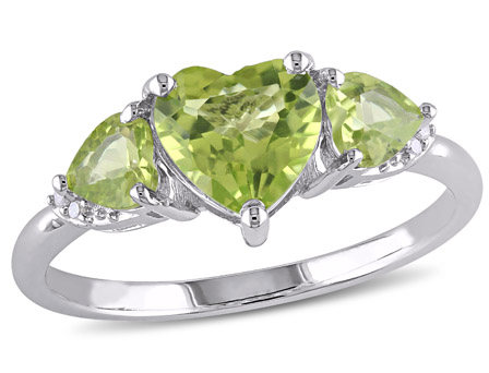 Surprise your loved one with this stylish Amour Collection Peridot and Diamond Heart Ring that sparkles in lustrous sterling silver. This stylish ring features a heart-cut (7mm) peridot gemstone in the center and heart-cut (4mm) peridot side stones with six round-cut, pave-set diamond accents (G-H, 12-I3) shimmering along the band. This elegant ring is enhanced with a high polish finish.