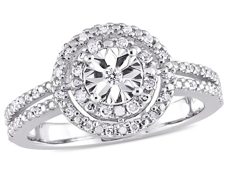 Get many compliments when you wear this Amour Collection Diamond Halo Engagement Ring. Crafted in lustrous sterling silver and features nine round-cut, prong-set diamonds (H-I, I3) studded at the center with 27 round-cut, buttercup-set diamonds studded on its double bands. Buffed with luster this engagement ring is the perfect addition to any jewelry collection. Watch her glow radiantly when you gift this engagement ring to your special someone.